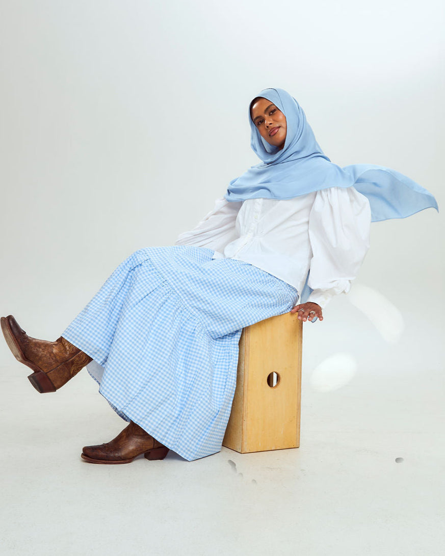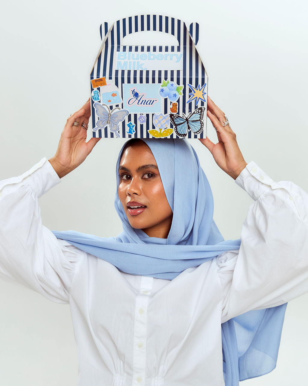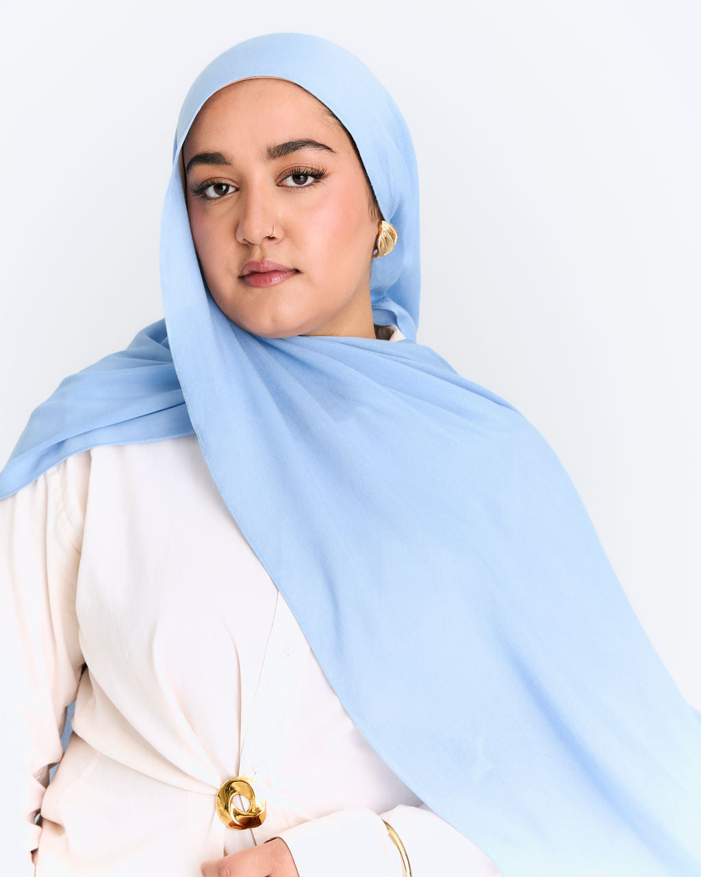 This soft pastel blue modal hijab has cool lavender undertones. Light, airy, and refreshingly smooth. Part of the Milk Series. It’s buttery soft, drapes beautifully, and lays perfectly on your head. Made from Anar’s Butter Modal fabric.