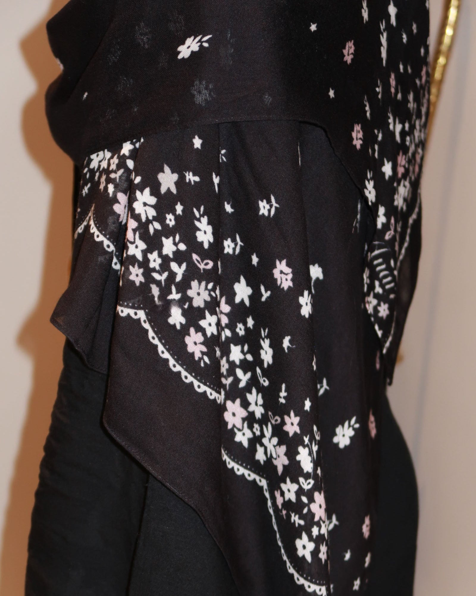 ❀ Inspired by the moment an early frost sends fresh spring blossoms falling to the ground. With white and pale pink florals drifting across the solid black base, this print captures the delicate beauty of "Spring Snow".